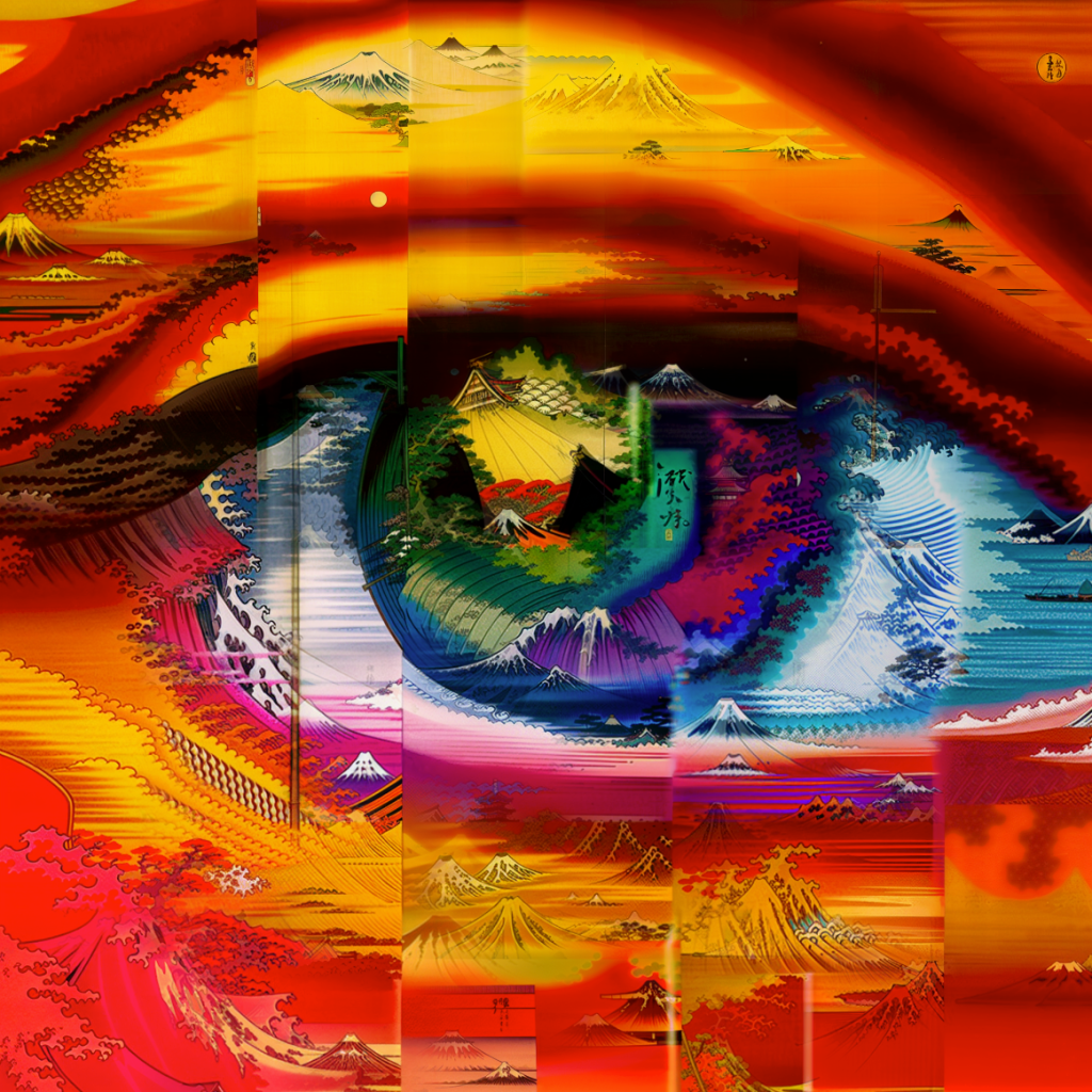 A media art work that considers the limits of human perception. The work is a picture of an “eye” when viewed from a distance, but when zoomed in, one realizes that different motifs such as mountains and oceans are written on it. 168 GPU hours were spent creating images with different micro and macro representations using a self-designed algorithm incorporating Stable Diffusion. This work takes advantage of the characteristics of generative AI, which is capable of very detailed writing. The work received an honorable mention in the first AI Art Grand Prix.